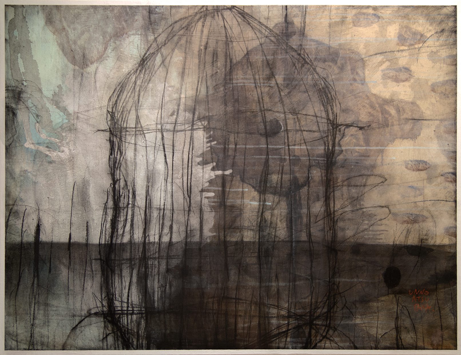 漉き紙にインク、油彩、鉛筆